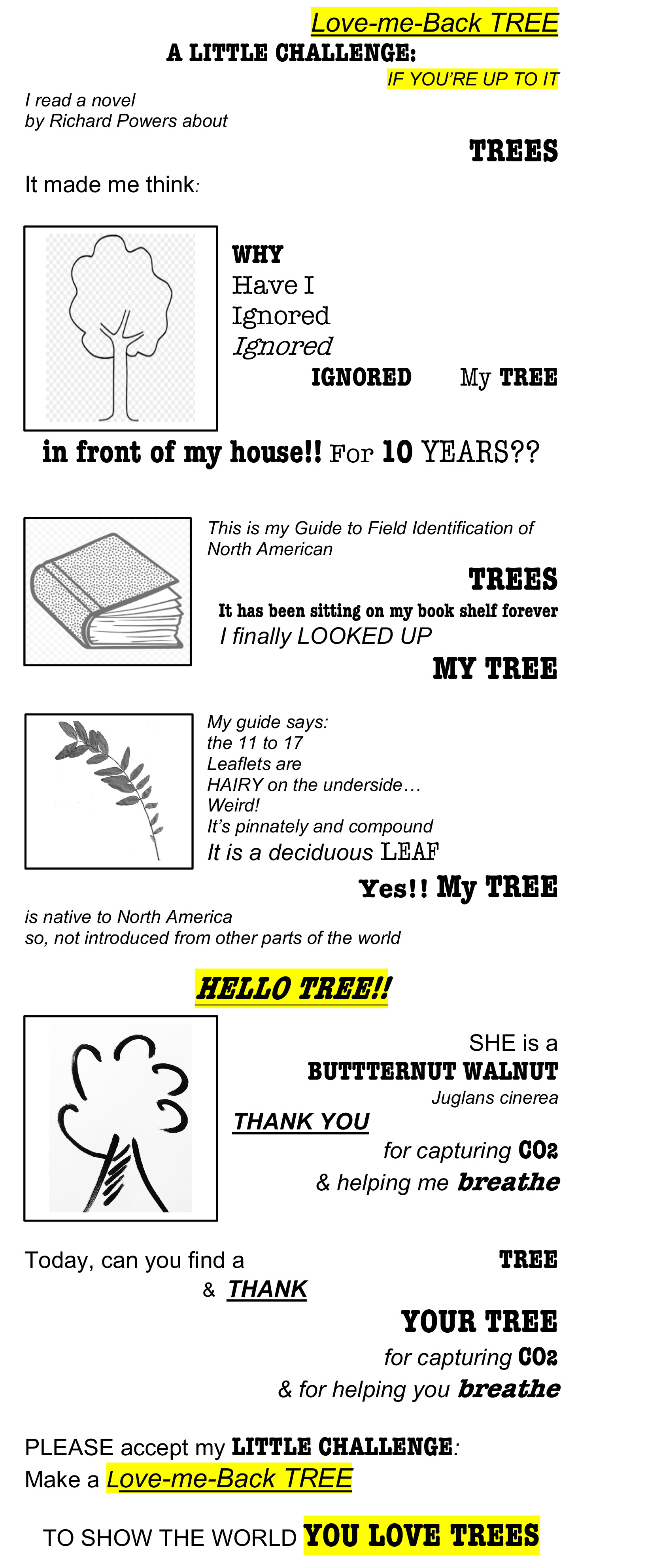 The Love-me-back TREE offers a small opportunity to participate in this important climate initiative. That’s my hope. Tape your tree to your desk, window sill or elsewhere. Let’s start a conversation!